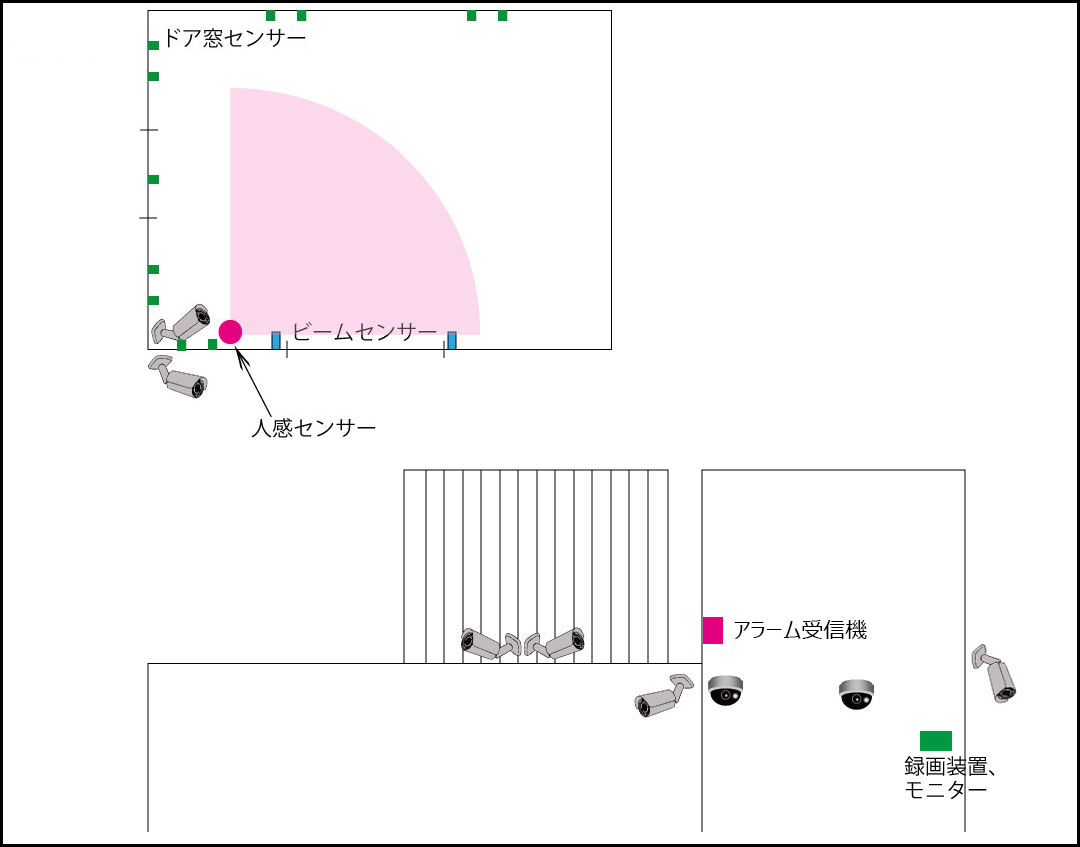 既設のアナログカメラからの置き換え及び増設で8台の210万画素HD-TVIカメラを設置させていただきました。またセキュリティシステムも既設のものに人感センサー、ビームセンサー、ドア・窓センサーを追加設置させていただきました。